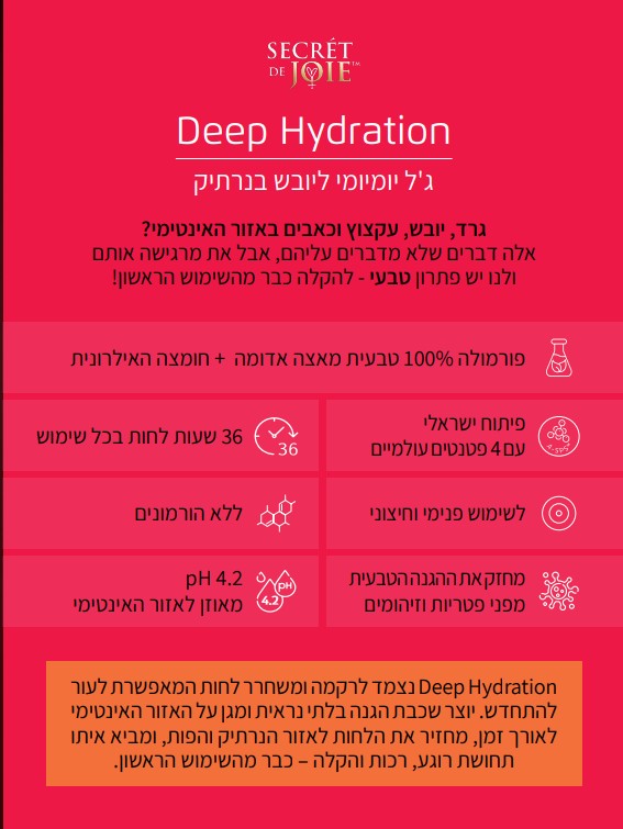 פורמולה פורצת דרך מאצה אדומה לטיפול ביובש נרתיקי. Deep Hydration פותח במיוחד למצבים של יובש בפות ובנרתיק. ג'ל אינטימי טבעי, שמחזיר את הלחות לאזור הנרתיק והפות, ומביא איתו תחושת רוגע, רכות והקלה – כבר מהשימוש הראשון.