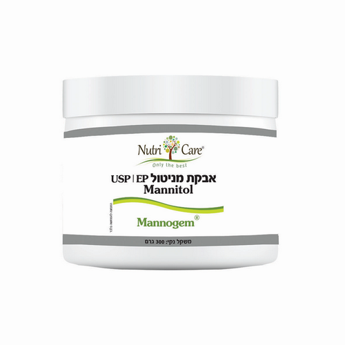 אבקת מניטול נוטריקר Mannitol Nutri care רכיבים: 100% אבקת מניטול מניטול הוא סוכר רב כוהלי שנמצא בצמחים, אצות, פטריות וחיידקים. השימוש בו הוא למזון ותעשיית התרופות. מניטול רפואי, מכיל מעל 98% חומר פעיל- די מניטול. מיוצר בארה"ב תחת תקנים בין לאומיים, תקן USP אמריקאי ותקן אירופאי EP. מיוצר במפעל בעל תקני GMP לתעשיית הפארמה והמזון. 300 גרם כשר פרווה בד"ץ חתם סופר