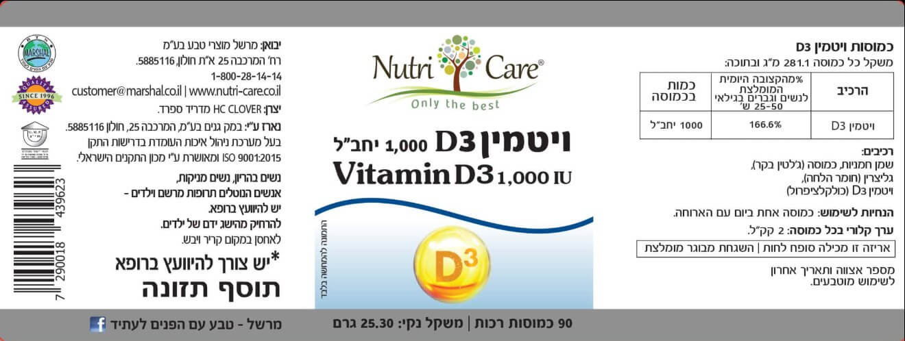 ויטמין די 3 1000 יחב"ל | Vitamin D3 1000 IU | מכיל 90 כמוסות רכות | נוטרי קר
