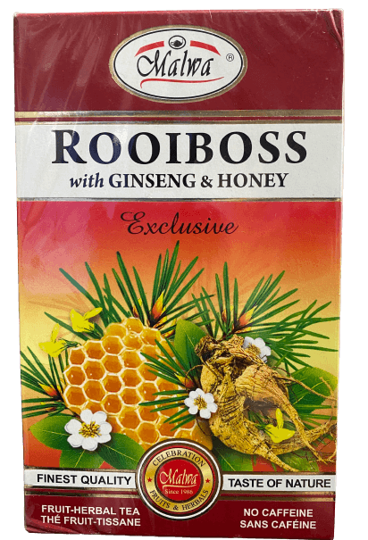 תה ללא קפאין Malwa Rooiboss מכיל ג'ינסנג, דבש ,פירות וצמחים. תערובת צמחים ופירות בטעם רויבוש עם גינסנג. רכיבים: רויבוש, גינסנג, דבש, חומר טעם וריח טבעי.