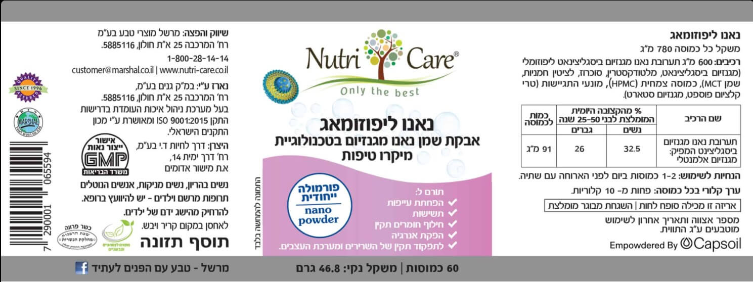 נאנו מגנזיום ביסגליצינט ליפוזומלי | (Liposamal Nano Magnesium Bisglycinate) | 60 כמוסות | נוטרי קר | Nutri Care