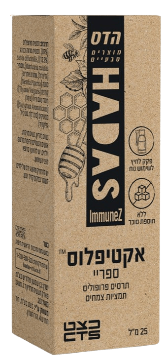 ספריי-תרסיס המשלב תמצית פרופוליס, תמציות צמחים (מרווה ובבונג) ותערובת שמנים צמחיים (מנטה, קורנית וציפורן)